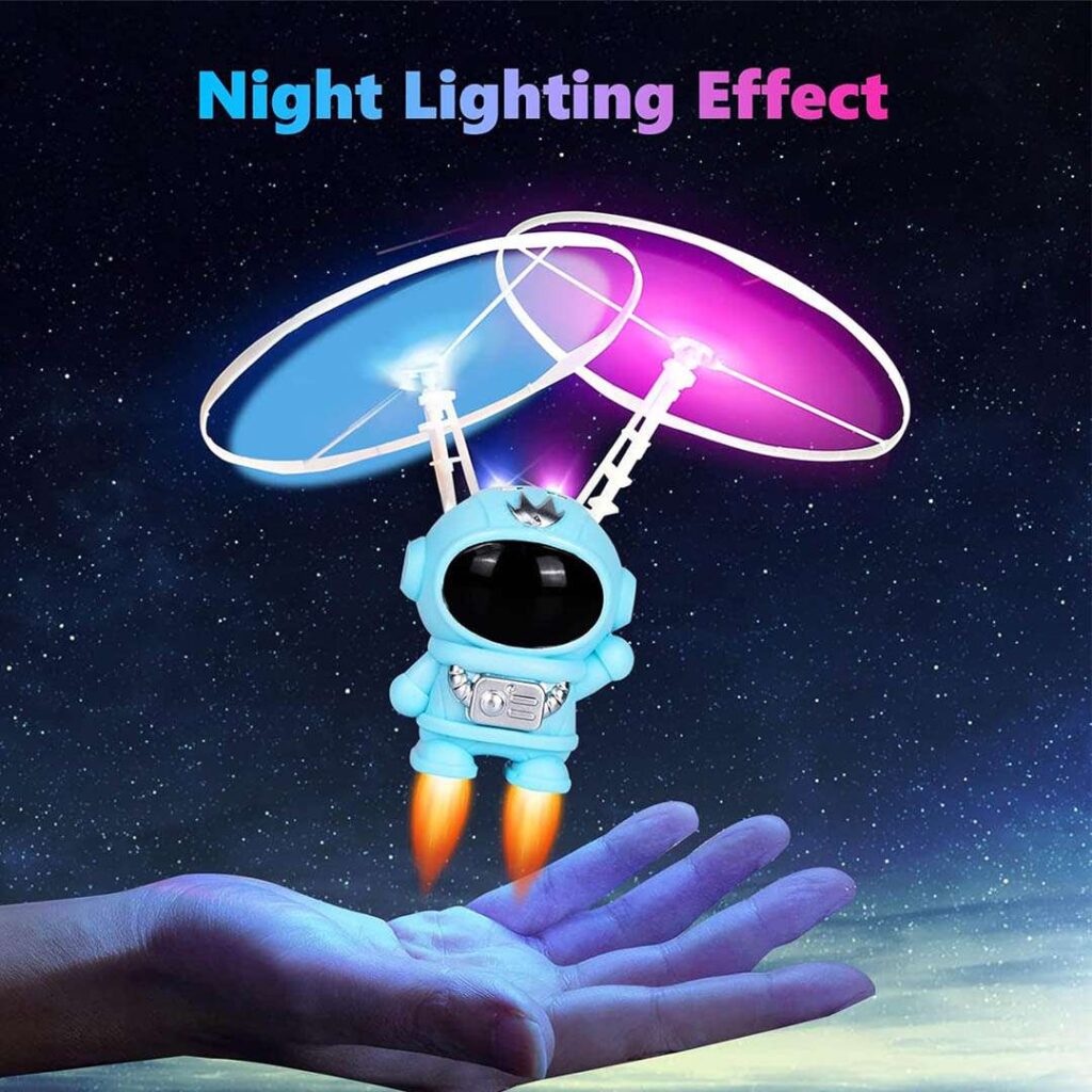 Emocionante juguete de inducción con diseño de astronauta en color Celeste. Equipado con dos hélices que salen desde su casco para volar, este juguete es una verdadera maravilla. Sus dos luces integradas en el casco en azul y amarillo iluminan las hélices con estilo. Con su sistema de batería recargable mediante cable USB y un práctico interruptor de encendido junto a su puerto de carga en la parte trasera, su uso es sencillo. Fabricado con plástico resistente para horas de diversión.