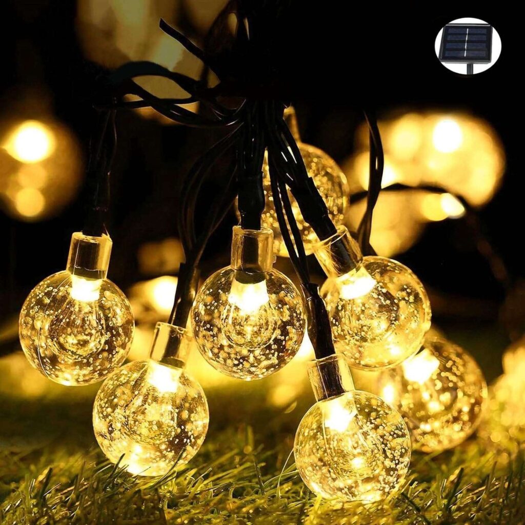 Guirnalda de luces solares con forma de globo, 100 luces de cadena con bolas de cristal para exteriores, decoración de jardín, cenador, patio y más, luz cálida.Características: