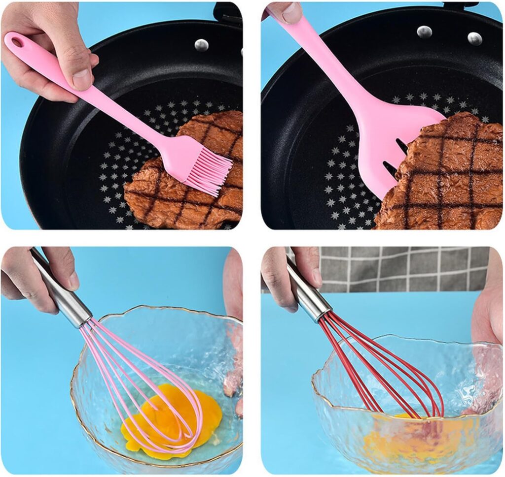 ¡Transforma tu cocina en un espacio de creatividad y eficiencia con este completo set de utensilios de silicona! Perfecto para repostería, horneado y cocinar con facilidad, sin preocuparnos por dañar tus utensilios o superficies de cocina.