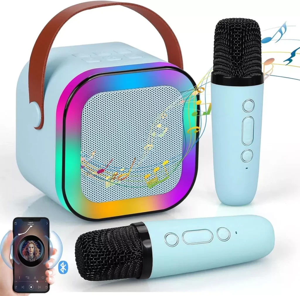 Parlante Altavoz de Karaoke 2 Micrófonos RGB (colores)Parlante Portátil con 2 Micrófonos y Luces LED RGB