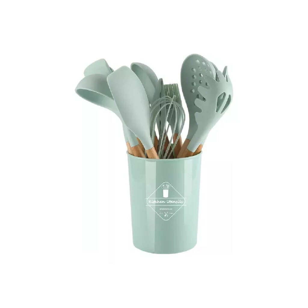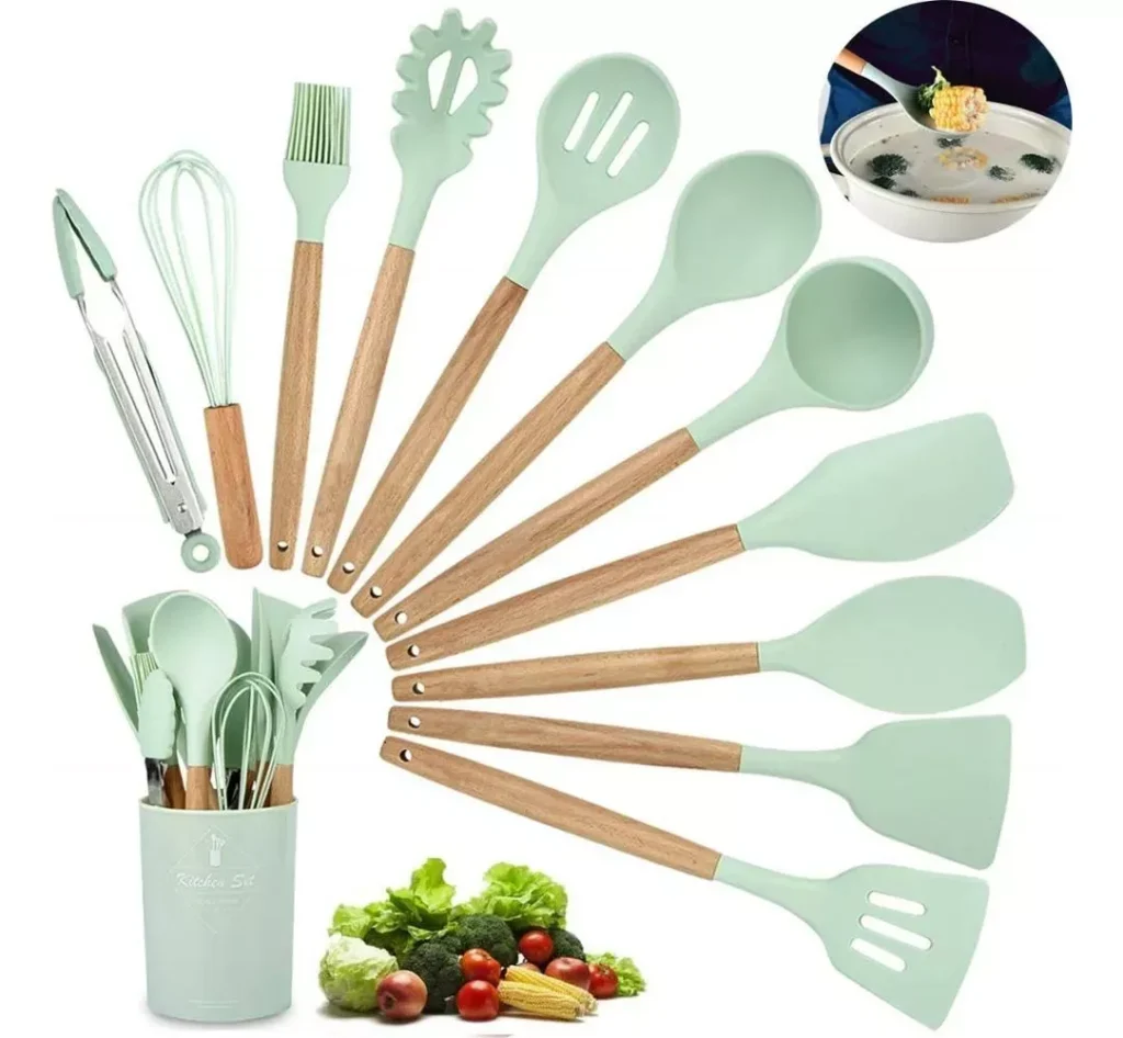 Set De Espatulas Cocina Antiadherente 12 Piezas Silicona y Madera + Vaso (Verde)Set de Espátulas de Silicona x12 🥄✨
